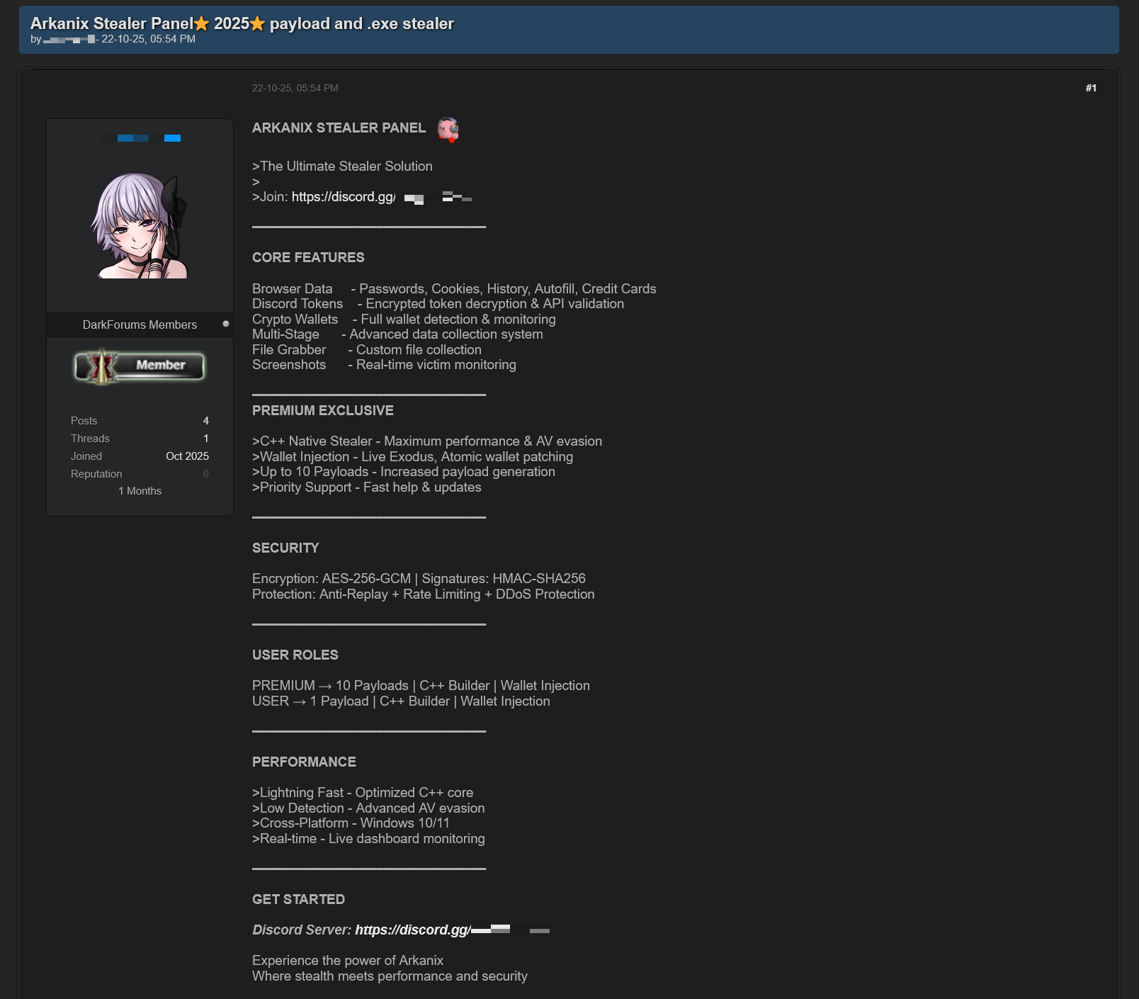 In October 2025, a series of posts was discovered on various dark web forums, advertising a stealer referred to by its author as “Arkanix Stealer”. These posts detail the features of the stealer and include a link to a Discord server, which serves as the primary communication channel between the author and the users of the stealer.