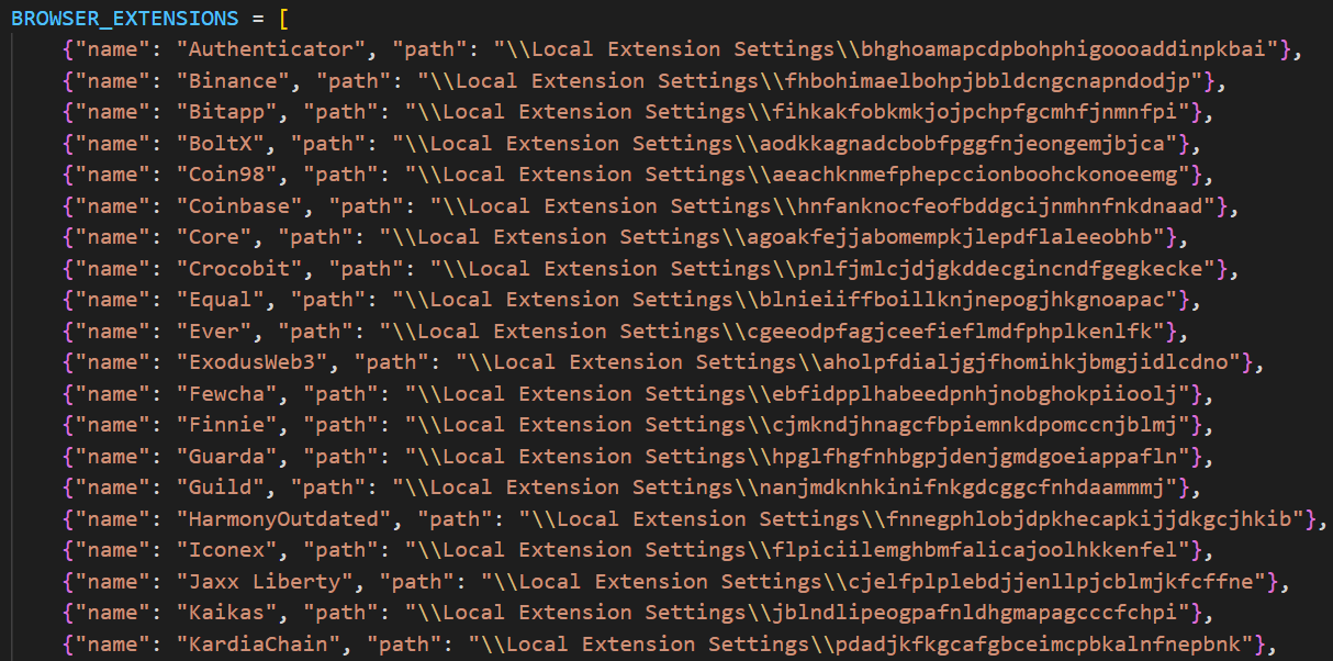 All information is decrypted using either the Windows DPAPI or AES, where applicable, and searched for relevant keywords. In the case of browser information collection, the stealer searches exclusively for keywords related to banking (e.g., “revolut”, “stripe”, “bank”) and cryptocurrencies (e.g., “binance”, “metamask”, “wallet”). In addition to this, the stealer is capable of extracting extension data from a hardcoded list of extensions associated with cryptocurrencies.