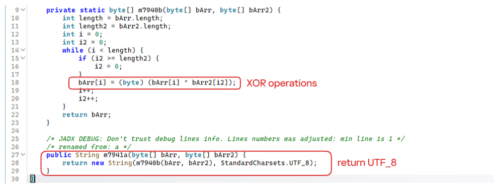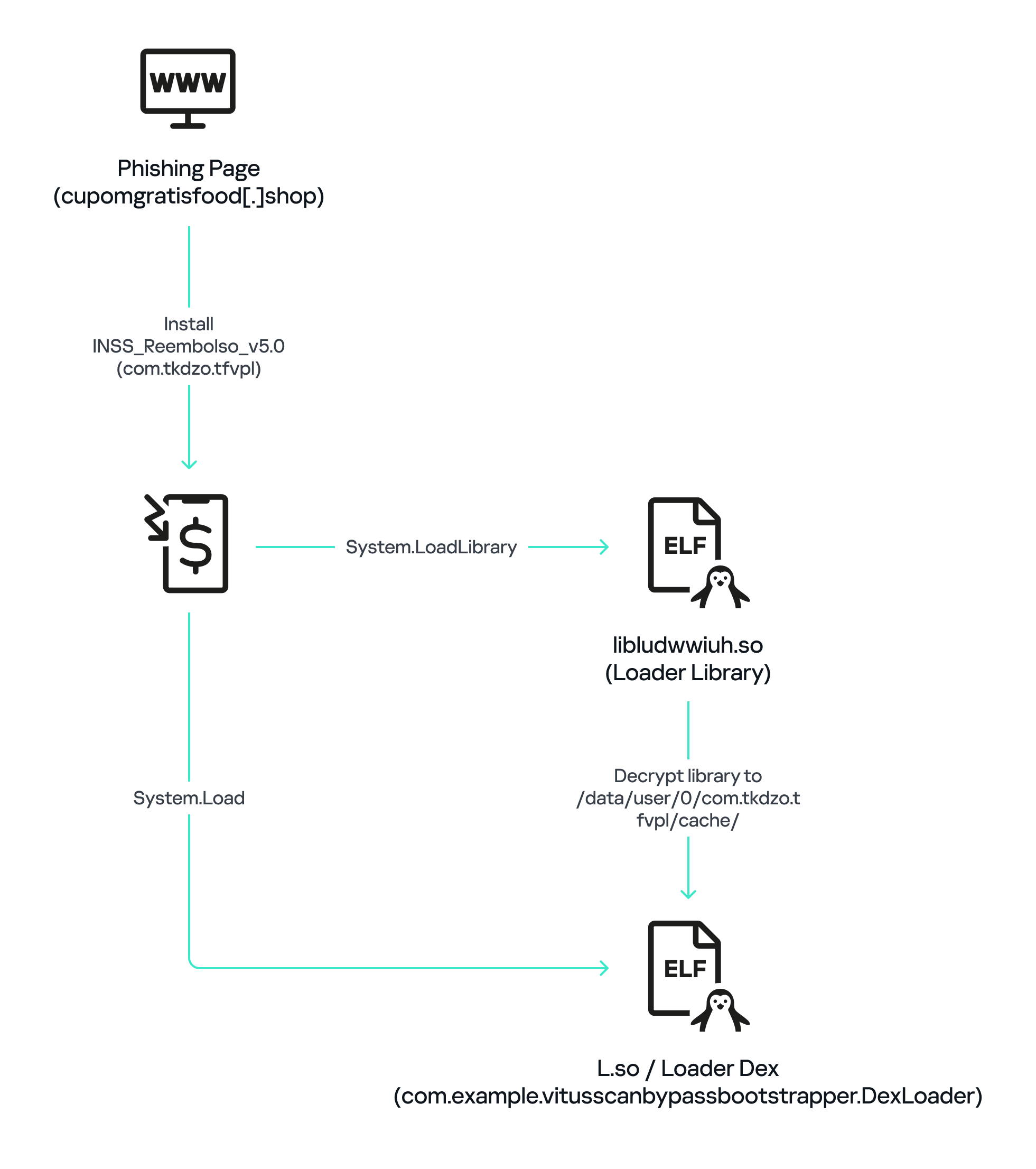 First, libludwwiuh.so decrypts an embedded encrypted ELF file and drops it to a temporary location on the device under the name l.so. The same code that loaded the libludwwiuh.so library then loads this file, which uses the Java Native Interface (JNI) to continue execution.