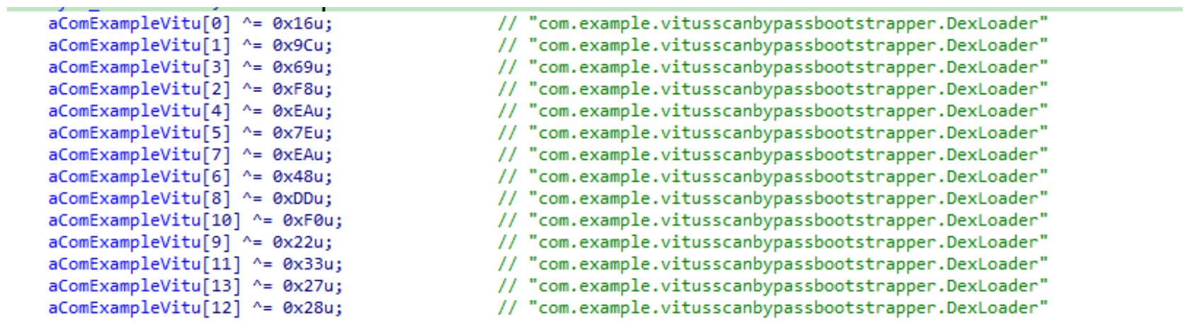 This loader is engineered to bypass mobile antivirus products by utilizing dalvik.system.InMemoryDexClassLoader. It loads malicious DEX code directly into memory, avoiding the creation of any files on the device’s file system. The necessary DEX files can be extracted using dynamic analysis tools like Frida.