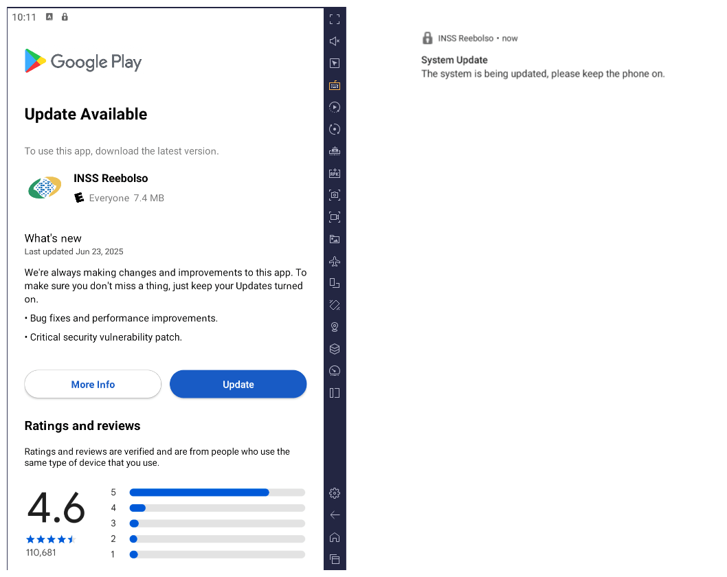 After execution, the malware displays a user interface that mimics the Google Play Store page, showing an update available for the INSS Reembolso app. This is intended to trick victims into granting installation permissions by tapping the “Update” button, which allows the download of additional hidden malicious payloads.