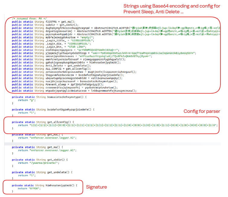The BTMOB APK is highly obfuscated and contains a class responsible for configuration. Despite this, it’s possible to identify a parser used to define the application’s behavior on the device, as well as persistence features, such as protection against restart, deletion, lock reset, and the ability to perform real-time screen recording.