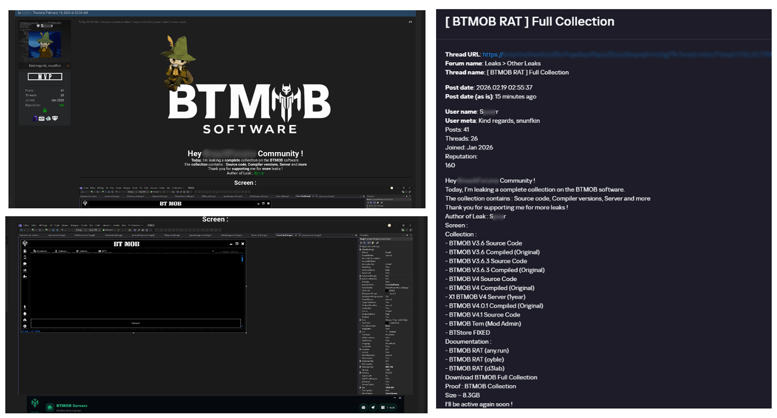 We also saw the distribution and sale of leaked BTMOB source code on some dark web forums. This may suggest that the creator of BeatBanker acquired BTMOB from its original author or the source of the leak and is utilizing it as the final payload, replacing the banking module observed in the INSS Reebolso incident.