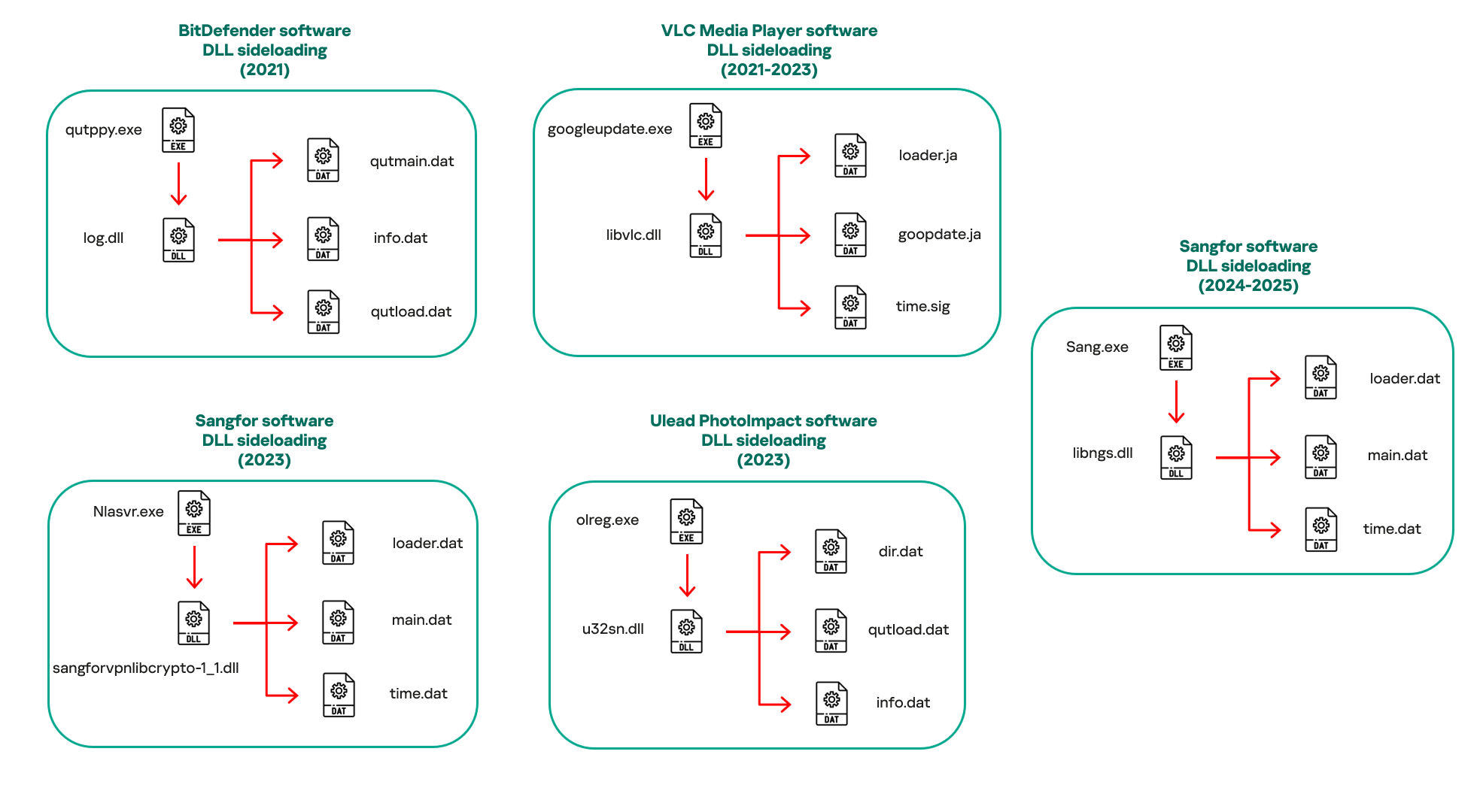 In our observations, CoolClient was typically delivered alongside encrypted loader files containing encrypted configuration data, shellcode, and in-memory next-stage DLL modules. These modules relied on DLL sideloading as their primary execution method, which required a legitimate signed executable to load a malicious DLL. Between 2021 and 2025, the threat actor abused signed binaries from various software products, including BitDefender, VLC Media Player, Ulead PhotoImpact, and several Sangfor solutions.