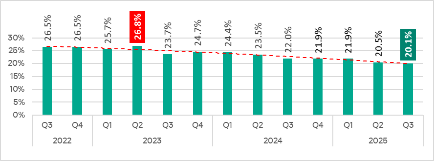 In Q3 2025, the percentage of ICS computers on which malicious objects were blocked decreased from the previous quarter by 0.4 pp to 20.1%. This is the lowest level for the observed period.