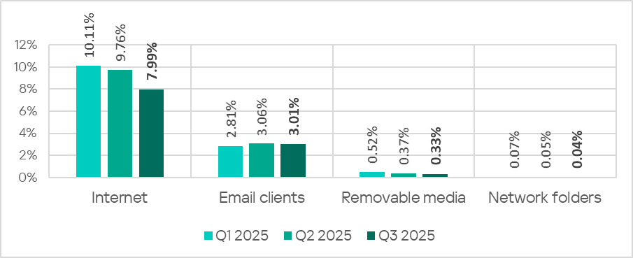 The internet (visiting malicious or compromised internet resources; malicious content distributed via messengers; cloud data storage and processing services and CDNs), email clients (phishing emails), and removable storage devices remain the primary sources of threats to computers in an organization’s technology infrastructure.