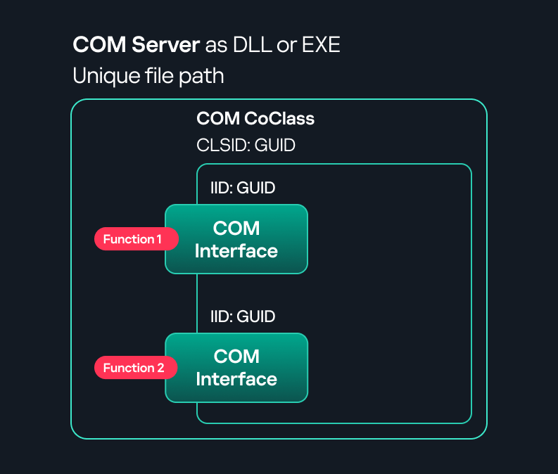 A COM interface defines the functionality that a COM object exposes. Each COM interface is identified by a unique GUID known as the IID (Interface ID). All COM interfaces can be found in the Windows Registry under HKEY_CLASSES_ROOT\Interface, where they are organized by GUID. - COM class (COM CoClass)
