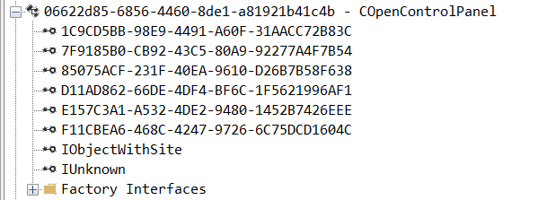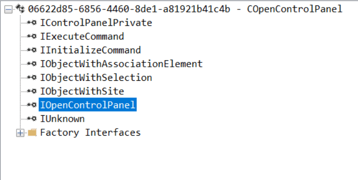 While following the manual approach of enumerating COM/DCOM objects that could be useful for lateral movement, I came across a COM object called COpenControlPanel, which is exposed through shell32.dll and has the CLSID {06622D85-6856-4460-8DE1-A81921B41C4B}. This object exposes multiple interfaces, one of which is IOpenControlPanel with IID {D11AD862-66DE-4DF4-BF6C-1F5621996AF1}.