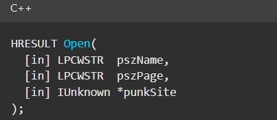 Normally, checking the interface definition would require reverse engineering, so at first, it looked like we needed to take a different research path. However, it turned out that the IOpenControlPanel interface is documented on MSDN, and according to the documentation, it exposes several functions. One of them, called Open, allows a specified Control Panel item to be opened using its name as the first argument.
