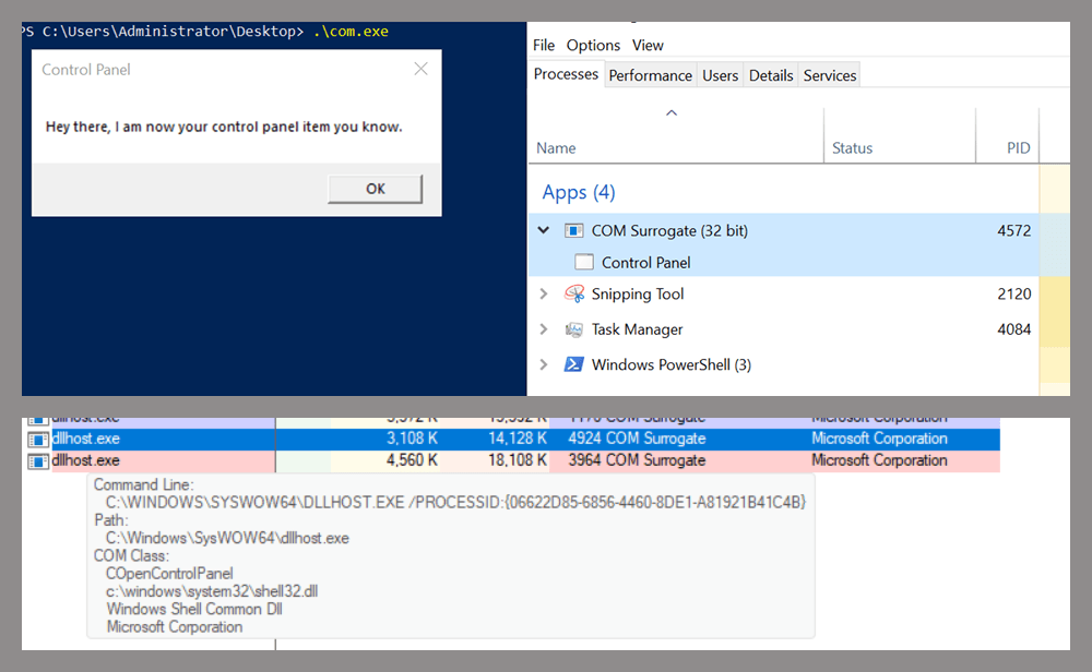 As expected, the DLL was loaded into memory. It was hosted in the same way that it would be if the Control Panel itself was opened: through the COM Surrogate process (dllhost.exe). Using Process Explorer, it was clear that dllhost.exe loaded my DLL while simultaneously hosting the COpenControlPanel object along with other COM objects.