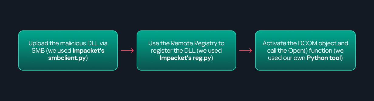 Based on this, we can build a remote strategy. First, upload the “malicious” DLL, then use the Remote Registry service to register it in the appropriate registry location. Finally, use a trigger acting as a DCOM client to remotely invoke the Open() function, causing our DLL to be loaded. The diagram below illustrates the flow of this approach.