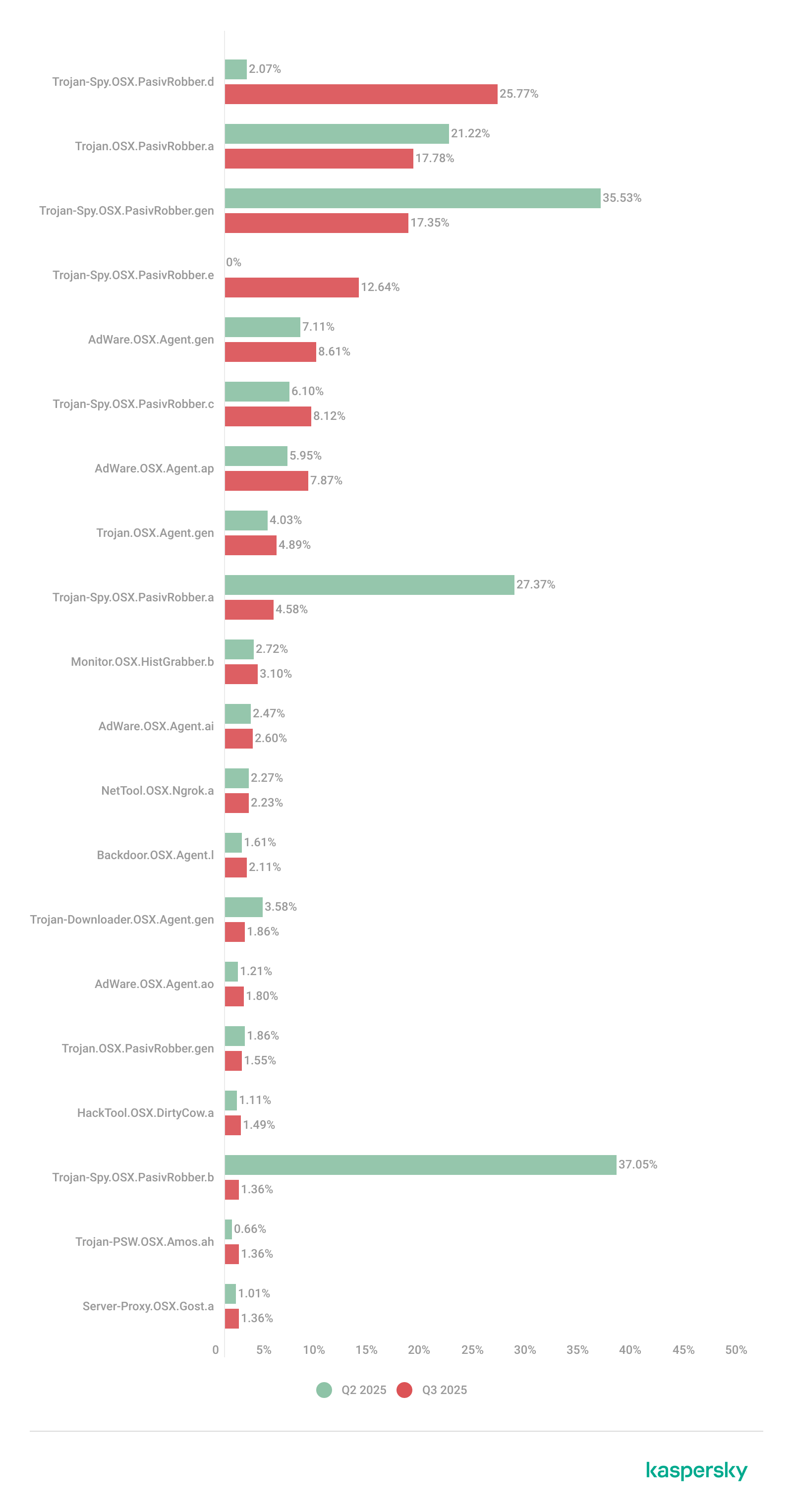 The PasivRobber spyware continues to increase its activity, with its modifications occupying the top spots in the list of the most widespread macOS malware varieties. Other highly active threats include Amos Trojans, which steal passwords and cryptocurrency wallet data, and various adware. The Backdoor.OSX.Agent.l family, which took thirteenth place, represents a variation on the well-known open-source malware, Mettle.