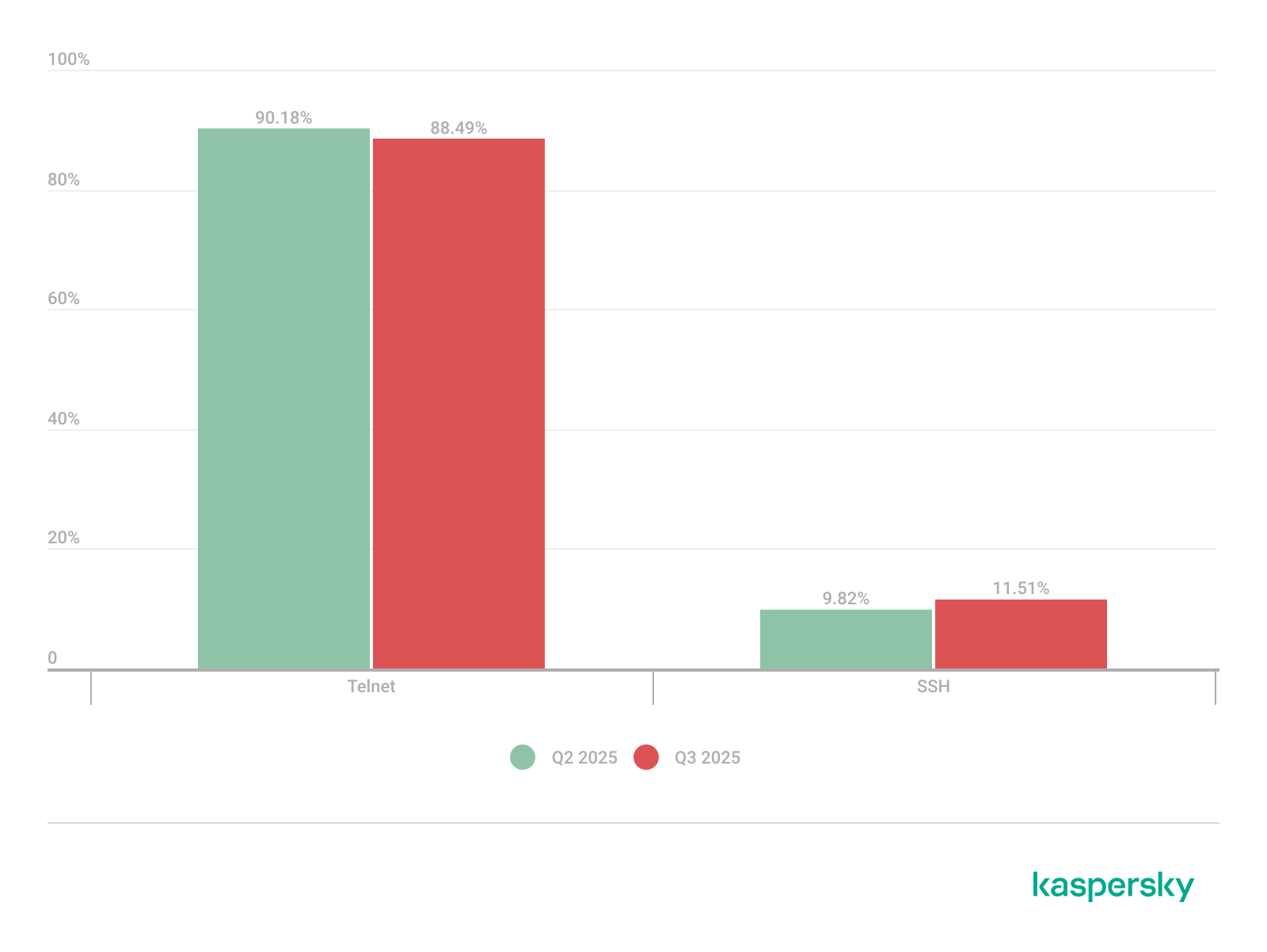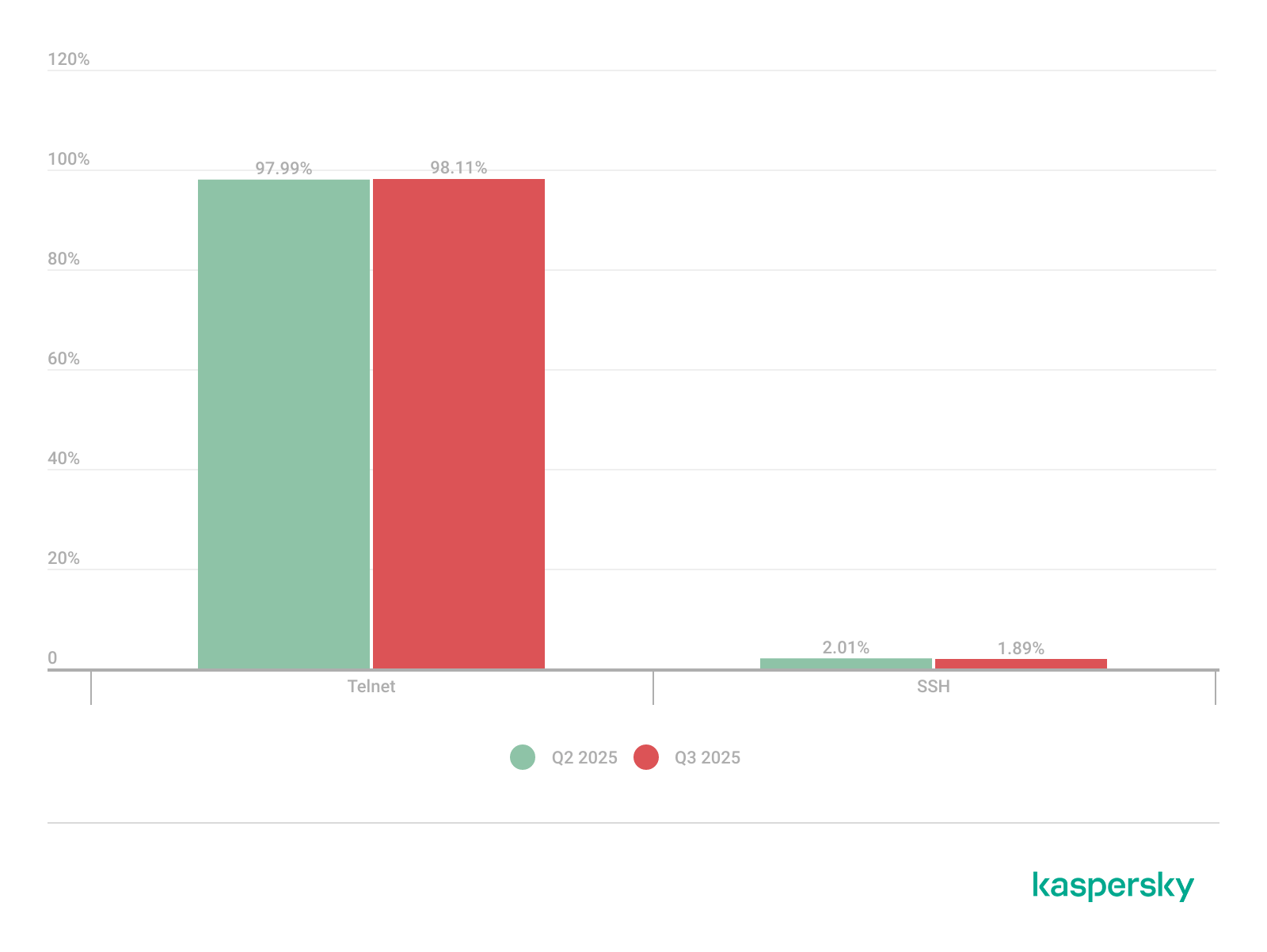 In Q3 2025, there was a slight increase in the share of devices attacking Kaspersky honeypots via the SSH protocol.