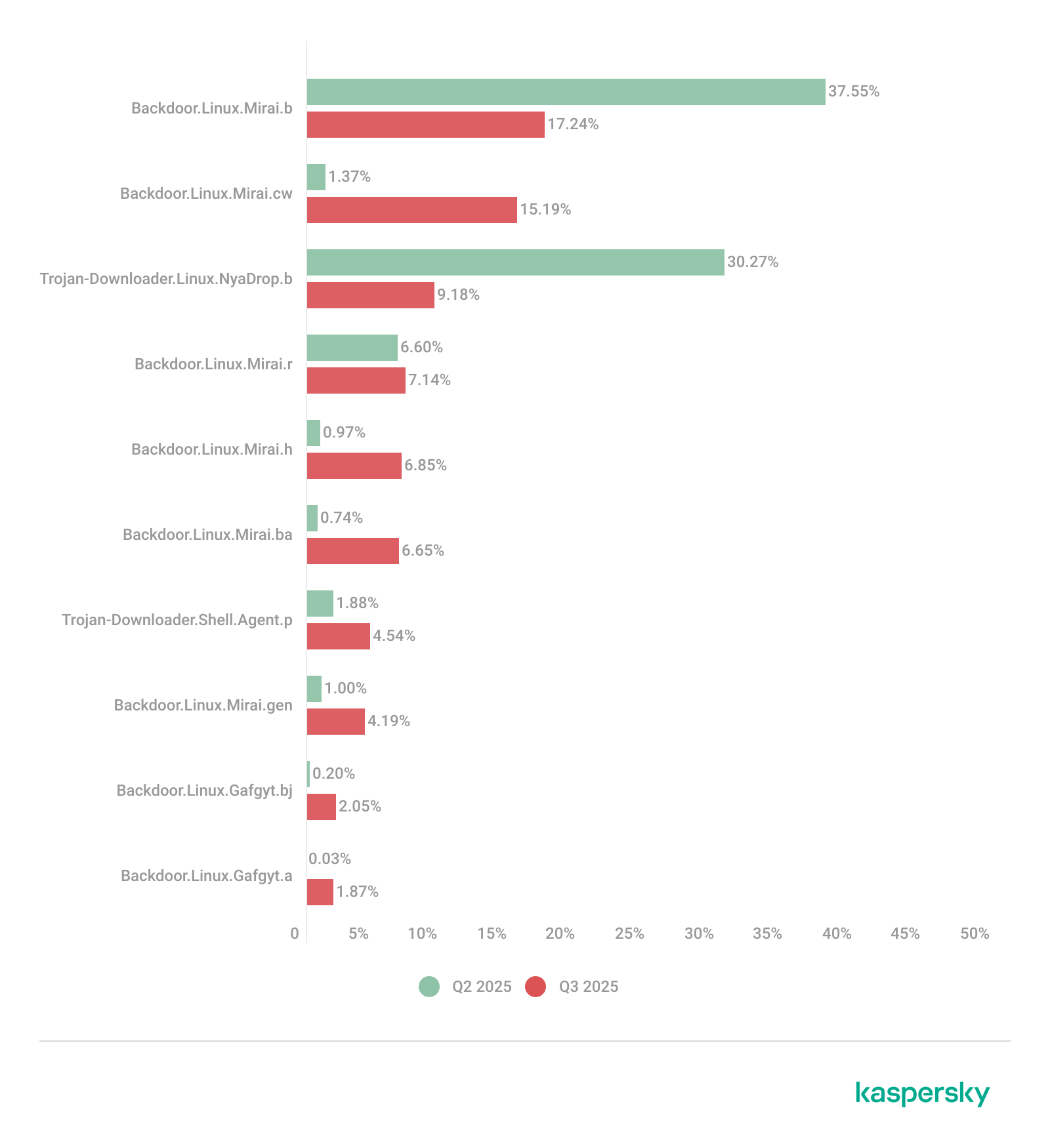 In the third quarter, the shares of the NyaDrop and Mirai.b botnets significantly decreased in the overall volume of IoT threats. Conversely, the activity of several other members of the Mirai family, as well as the Gafgyt botnet, increased. As is typical, various Mirai variants occupy the majority of the list of the most widespread malware strains.