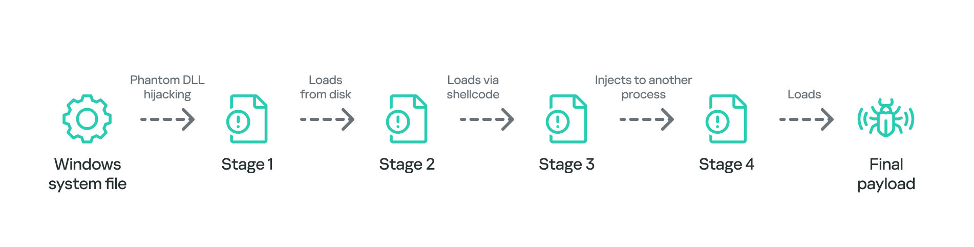 Having checked that it is operating on a target machine, the loader continues execution by loading a second-stage loader DLL that is stored on disk. The paths where the second-stage DLLs were stored as well as their names (examples include elscorewmyc.dll