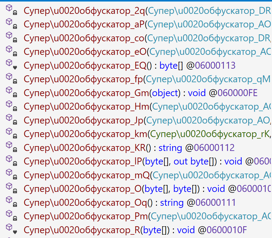 In the code of the NeuralExecutor samples we observed in 2024, the names of all functions had been replaced with strings prefixed with “Супер обфускатор”, the Russian for “Super obfuscator”. It is important to note, however, that this string was deliberately introduced by the attackers while using the ConfuserEx obfuscator. When it comes to strings that are inserted into malware on purpose, they should be assessed carefully during attribution. That is because threat actors may insert strings in languages they do not speak, in order to create false flags intended to confuse researchers and incident responders and prompt them to make an error of judgement when trying to attribute the threat. For that reason, we attached little evidential weight to the presence of the “Супер обфускатор” string back in 2024.