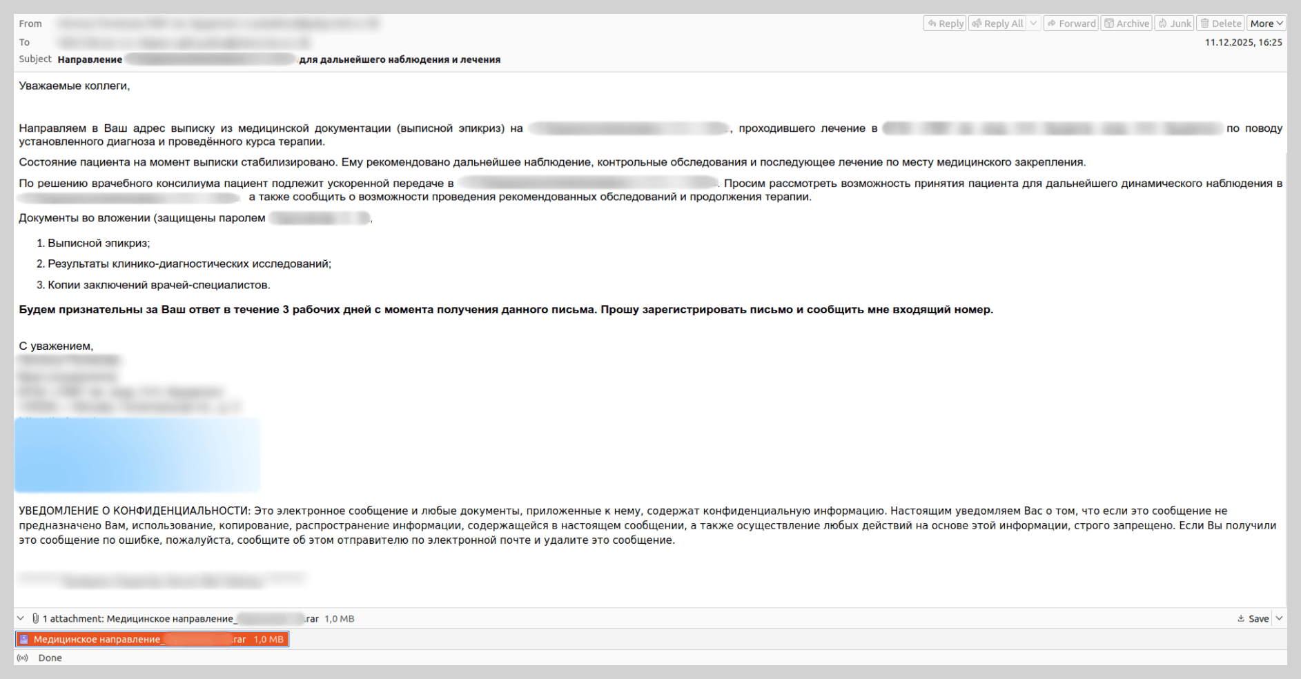 We also came across emails with a different narrative. In those instances, medical staff were requested to facilitate a patient transfer from another hospital for ongoing observation and treatment. These messages referenced attached medical files containing diagnostic and treatment history, which were actually archives containing malicious payloads.
