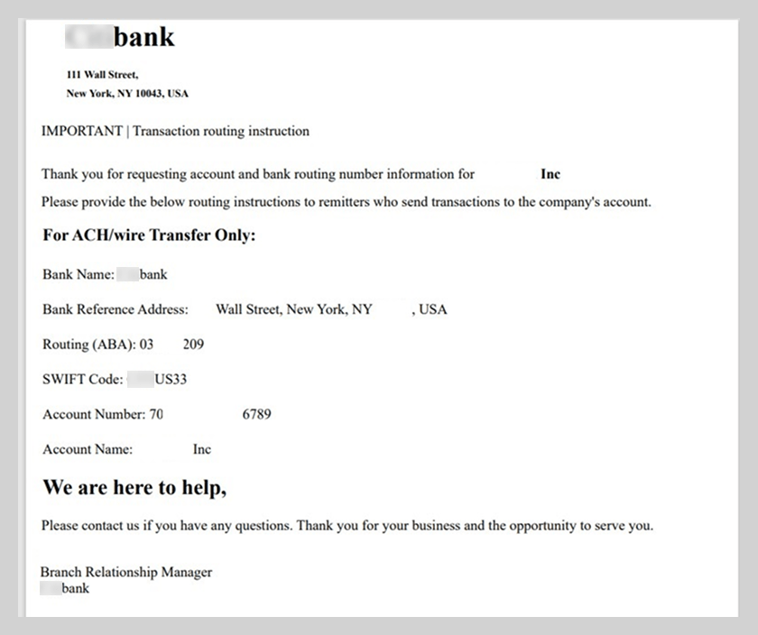 In the example at hand, the victim was pressured to urgently pay for a license using the provided banking details. The PDF attachments included wire transfer instructions and a counterfeit cover letter from the bank.