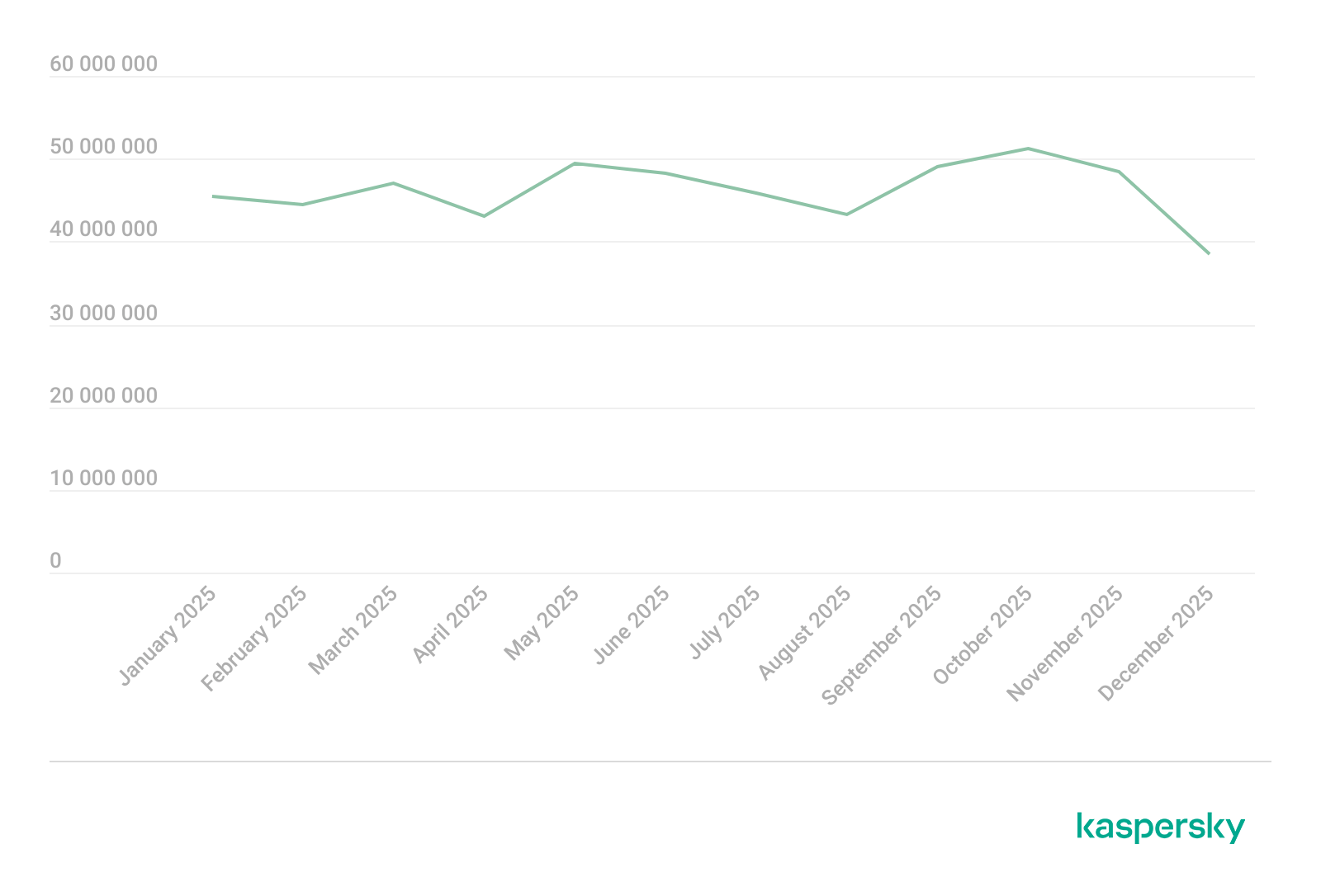 In 2025, Kaspersky solutions blocked 554,002,207 attempts to follow fraudulent links. In contrast to the trends of previous years, we did not observe any major spikes in phishing activity; instead, the volume of attacks remained relatively stable throughout the year, with the exception of a minor decline in December.