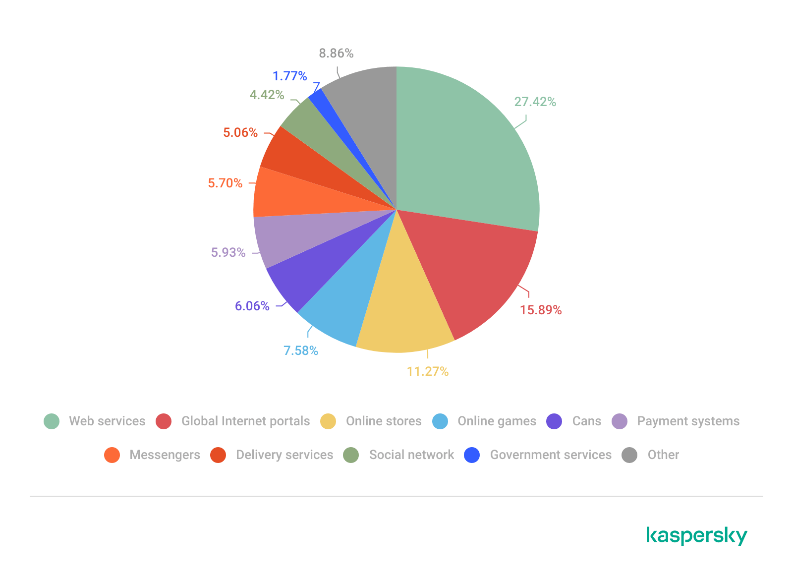 Phishing pages impersonating web services (27.42%) and global internet portals (15.89%) maintained their positions in the TOP 10, continuing to rank first and second, respectively. Online stores (11.27%), a traditional favorite among threat actors, returned to the third spot. In 2025, phishers showed increased interest in online gamers: websites mimicking gaming platforms jumped from ninth to fifth place (7.58%). These are followed by banks (6.06%), payment systems (5.93%), messengers (5.70%), and delivery services (5.06%). Phishing attacks also targeted social media (4.42%) and government services (1.77%) accounts.