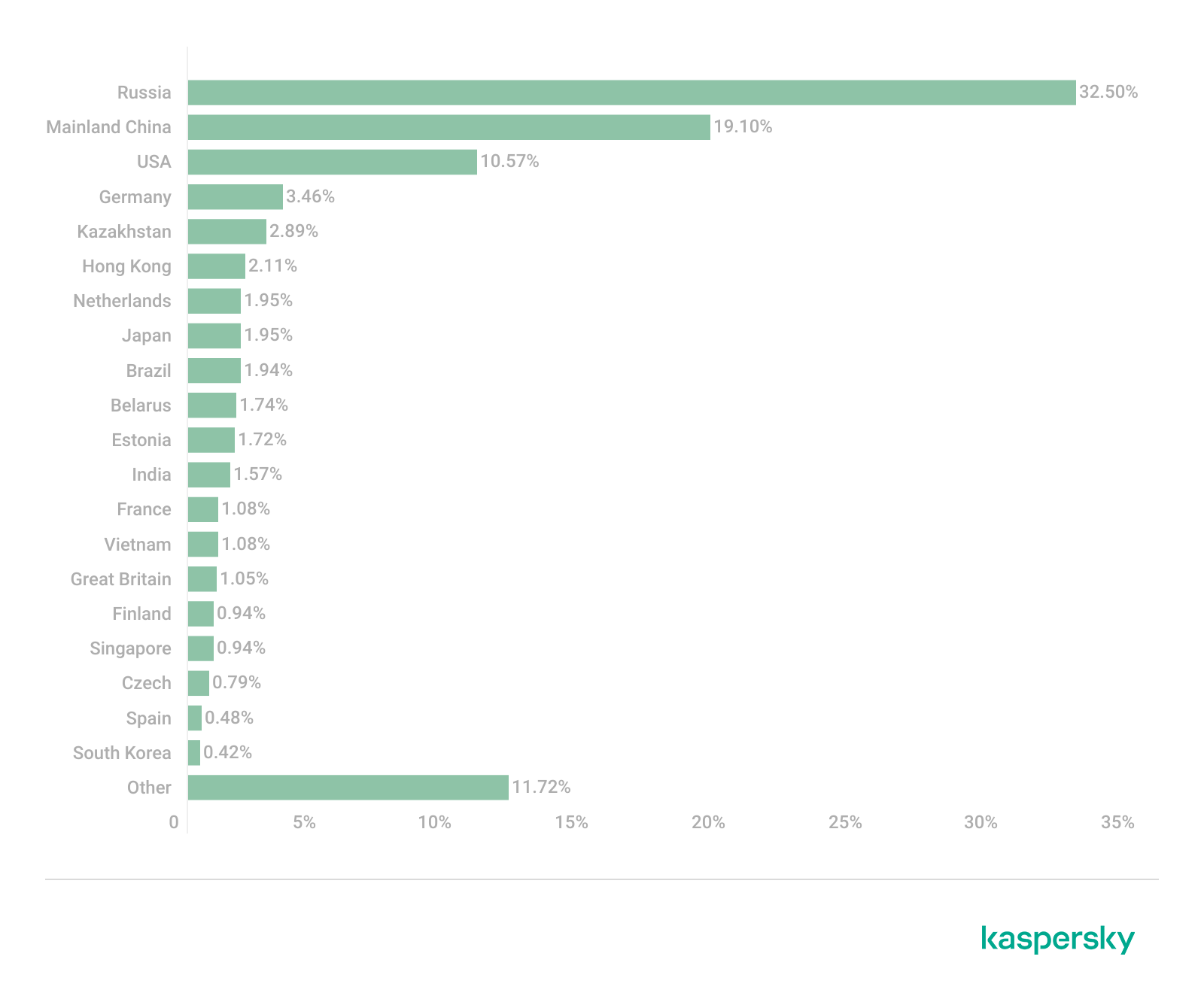 The top three countries in the 2025 rankings for the volume of outgoing spam mirror the distribution of the previous year: Russia, China, and the United States. However, the share of spam originating from Russia decreased from 36.18% to 32.50%, while the shares of China (19.10%) and the U.S. (10.57%) each increased by approximately 2 percentage points. Germany rose to fourth place (3.46%), up from sixth last year, displacing Kazakhstan (2.89%). Hong Kong followed in sixth place (2.11%). The Netherlands and Japan shared the next spot with identical shares of 1.95%; however, we observed a year-over-year increase in outgoing spam from the Netherlands, whereas Japan saw a decline. The TOP 10 is rounded out by Brazil (1.94%) and Belarus (1.74%), the latter ranking for the first time.