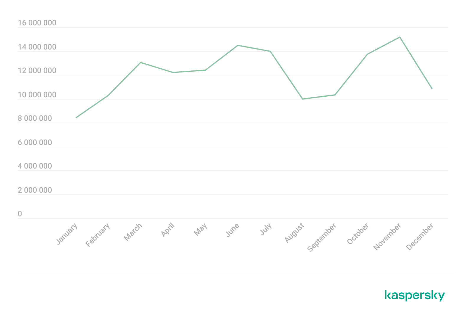In 2025, Kaspersky solutions blocked 144,722,674 malicious email attachments, an increase of nineteen million compared to the previous year. The beginning and end of the year were traditionally the most stable periods; however, we also observed a notable decline in activity during August and September. Peaks in email antivirus detections occurred in June, July, and November.