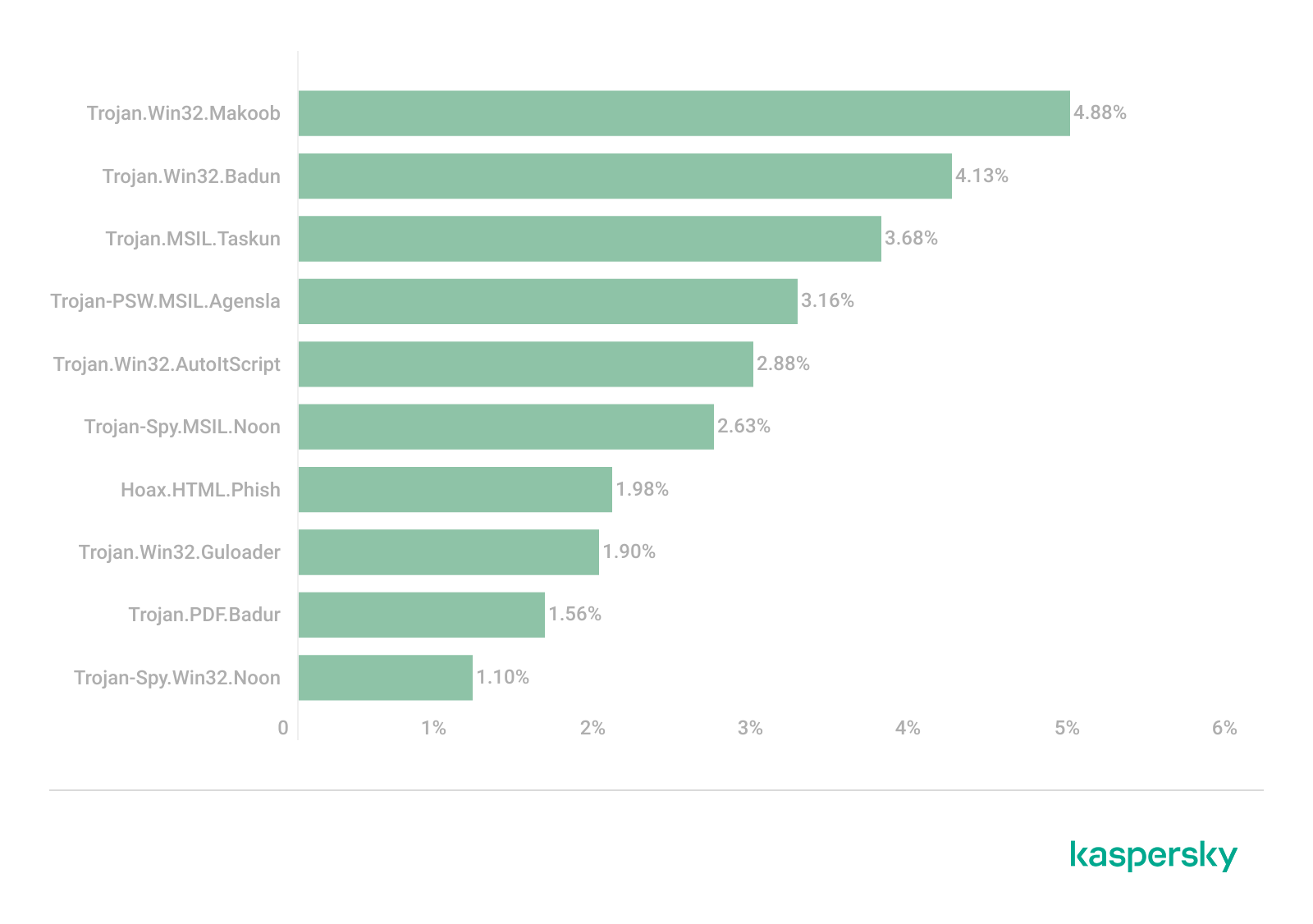 The most prevalent malicious email attachment in 2025 was the Makoob Trojan family, which covertly harvests system information and user credentials. Makoob first entered the TOP 10 in 2023 in eighth place, rose to third in 2024, and secured the top spot in 2025 with a share of 4.88%. Following Makoob, as in the previous year, was the Badun Trojan family (4.13%), which typically disguises itself as electronic documents. The third spot is held by the Taskun family (3.68%), which creates malicious scheduled tasks, followed by Agensla stealers (3.16%), which were the most common malicious attachments in 2024. Next are Trojan.Win32.AutoItScript scripts (2.88%), appearing in the rankings for the first time. In sixth place is the Noon spyware for all Windows systems (2.63%), which also occupied the tenth spot with its variant specifically targeting 32-bit systems (1.10%). Rounding out the TOP 10 are Hoax.HTML.Phish (1.98%) phishing attachments, Guloader downloaders (1.90%) – a newcomer to the rankings – and Badur (1.56%) PDF documents containing suspicious links.