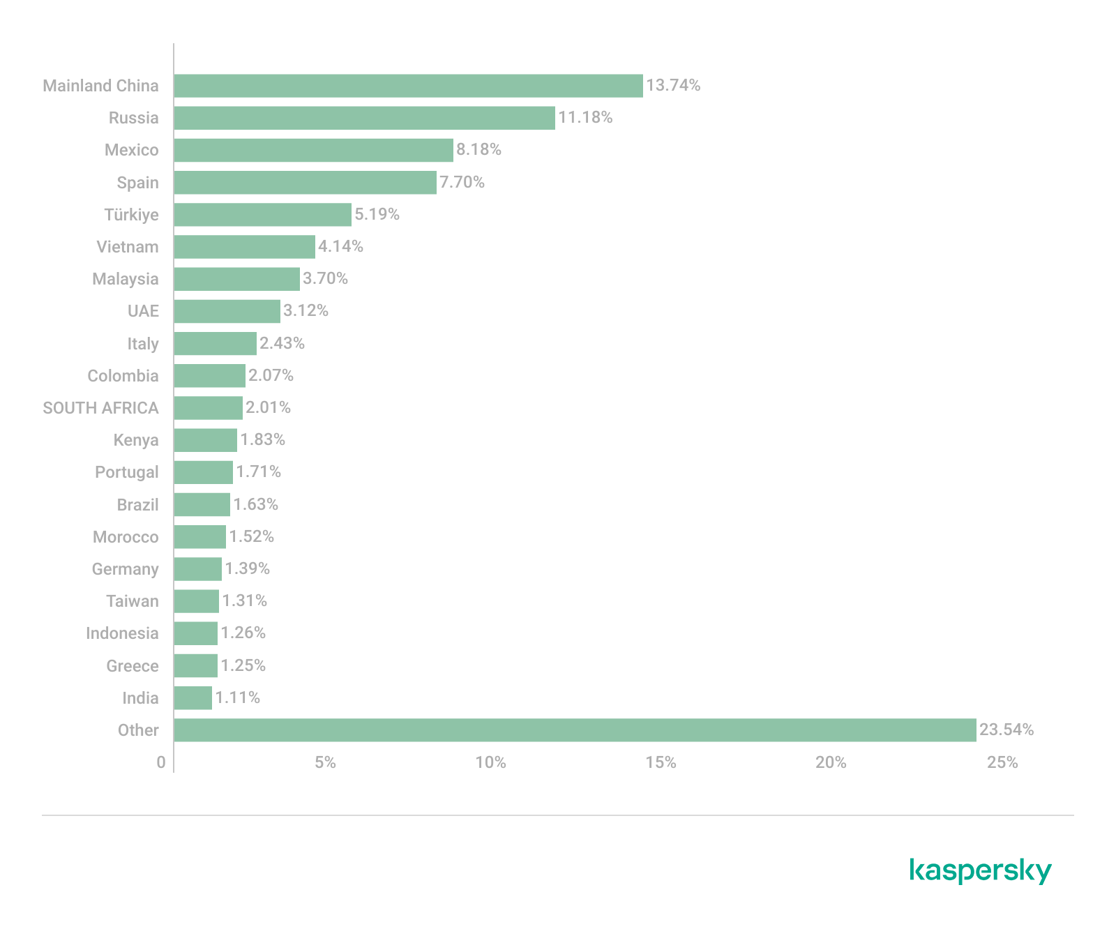 The highest volume of malicious email attachments was blocked on devices belonging to users in China (13.74%). For the first time in two years, Russia dropped to second place with a share of 11.18%. Following closely behind are Mexico (8.18%) and Spain (7.70%), which swapped places compared to the previous year. Email antivirus triggers saw a slight increase in Türkiye (5.19%), which maintained its fifth-place position. Sixth and seventh places are held by Vietnam (4.14%) and Malaysia (3.70%); both countries climbed higher in the TOP 10 due to an increase in detection shares. These are followed by the UAE (3.12%), which held its position from the previous year. Italy (2.43%) and Colombia (2.07%) also entered the TOP 10 list of targets for malicious mailshots.