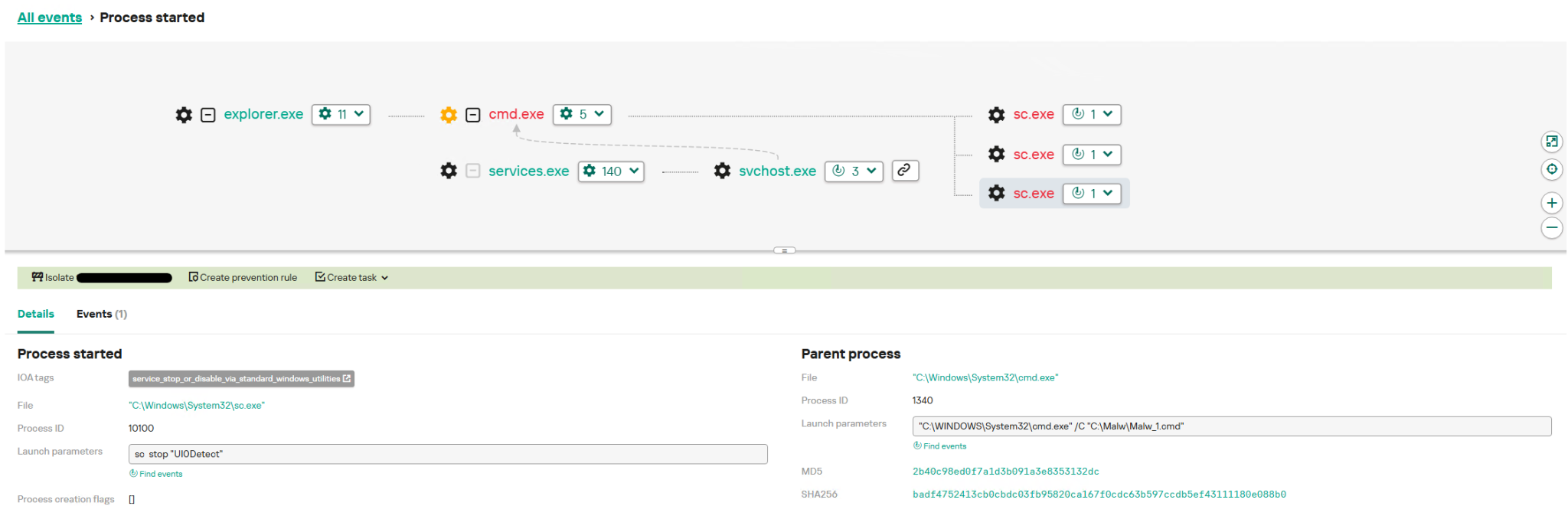 Querying the status and stopping the UI0Detect system service triggers several rules in Kaspersky EDR Expert. These rules are also available in Threat Intelligence Portal:
