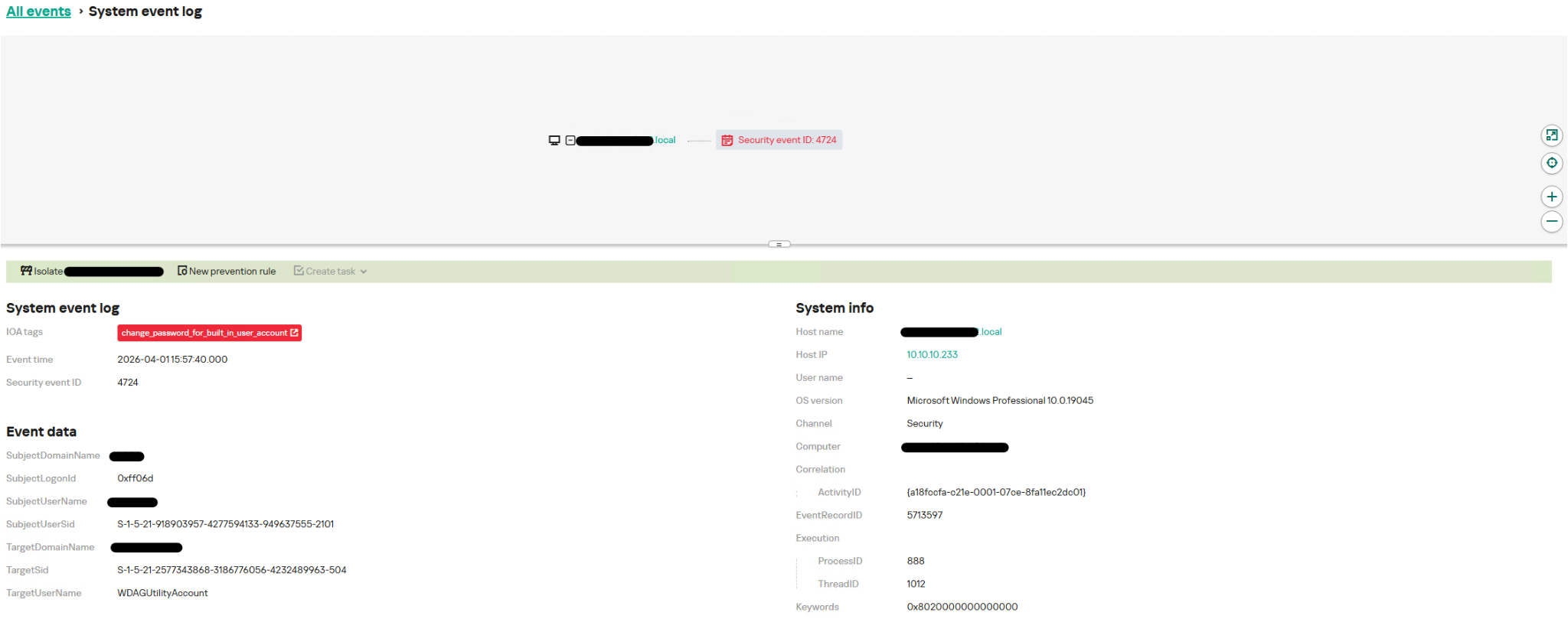 Modifying and disabling user accounts in a loop corresponds to Windows system event 4724, which triggers the change_password_for_built_in_user_account rule.