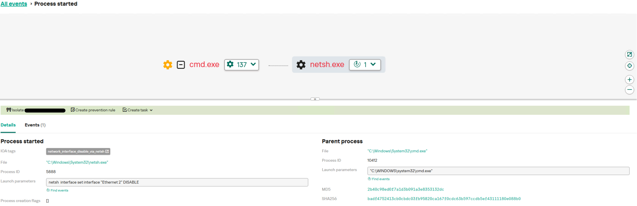 The network_interface_disable_via_netsh rule is triggered when network interfaces are being disabled. As the name suggests, this rule monitors the disabling of network interfaces using the netsh.exe utility: