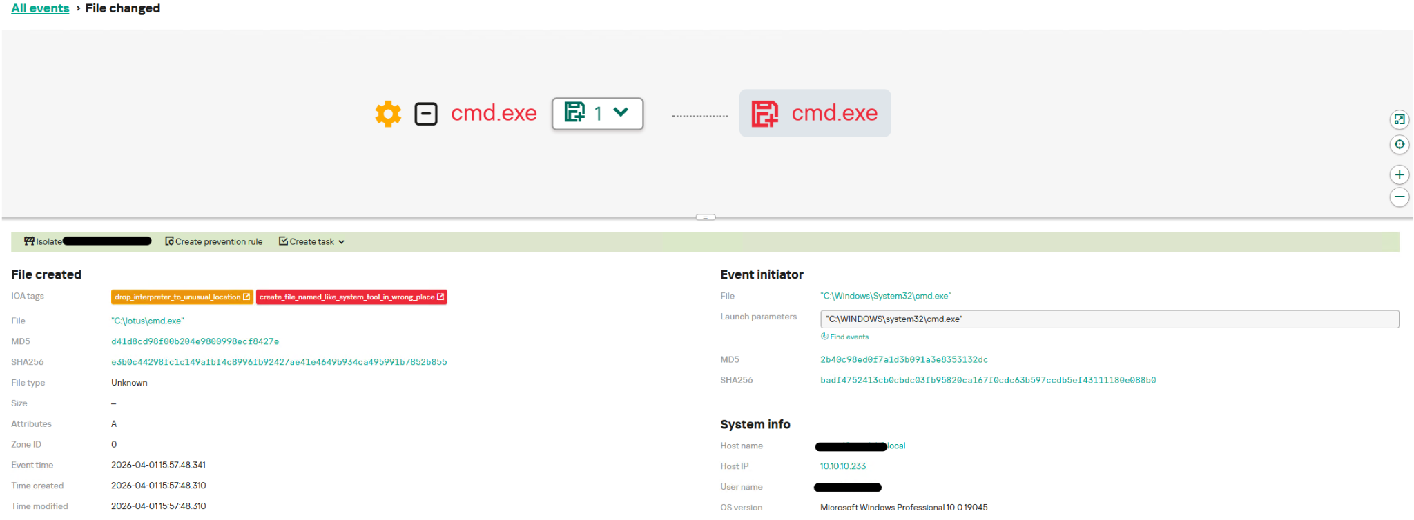 C:\lotus\cmd.exe; - The create_file_named_like_system_tool_in_wrong_place rule operates on a similar principle, but monitors a broader set of programs.