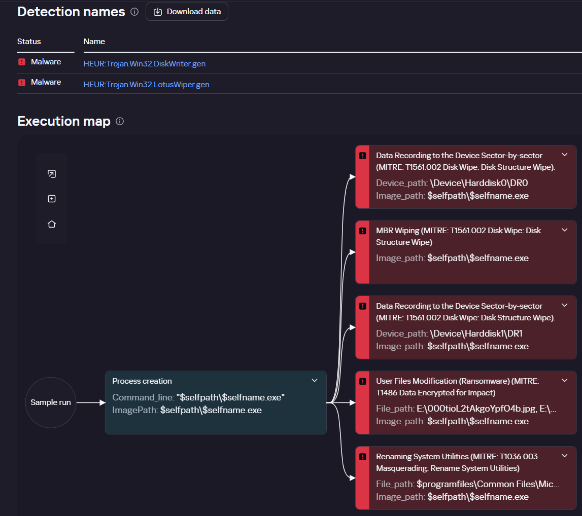 The dynamic execution flow of the Lotus Wiper samples can be obtained in the Kaspersky Threat Intelligence Portal using the Threat Analysis tool: